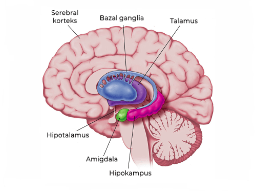 | Substantia nigra (SN) | Kara madde olarak bilinen bu çekirdekler iki kısımda değerlendirilir: Substantia nigra’nın pars retikulata bölümü (SNr) ve Substantia nigra’nın pars kompakta bölümü (SNc) bölümü. SNr-GPi kompleksi talamusu inhibe edici bir etkiye sahip olan birleşimdir. SNc kısmı ise striatal yolda dengenin korunması ve işlevin yerine getirilmesi için büyük rolü bulunan dopamin nörotransmitterini üretir. |