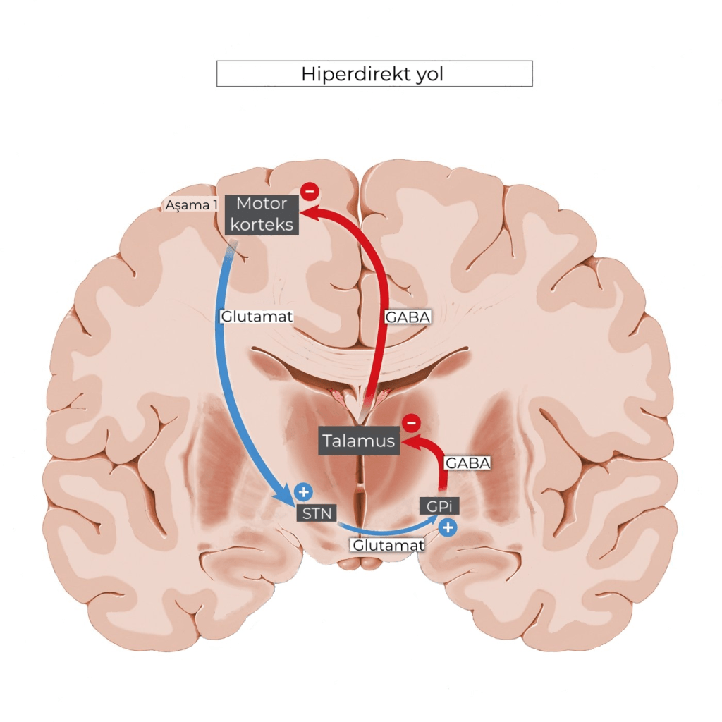 • Hiperdirekt yol bileşenleri: Motor korteks, globus pallidus dış segment, globus pallidus iç segment, talamus, substantia nigra ve subtalamik çekirdek.