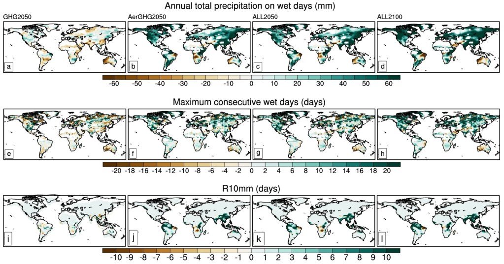 Likewise, the model examined alterations in annual mean precipitation worldwide under the same forcings. It revealed that tropical oceans, particularly the Western Pacific, encountered heightened rainfall solely due to greenhouse gas forcing. Introducing a reduction in aerosols to the simulation further intensified rainfall in the Northern Hemisphere but produced a contrasting effect in the Southern Hemisphere. Meanwhile, the reduction of tropospheric ozone had minimal impact on precipitation patterns, emphasizing the complex regional dynamics influenced by different climate forcings.