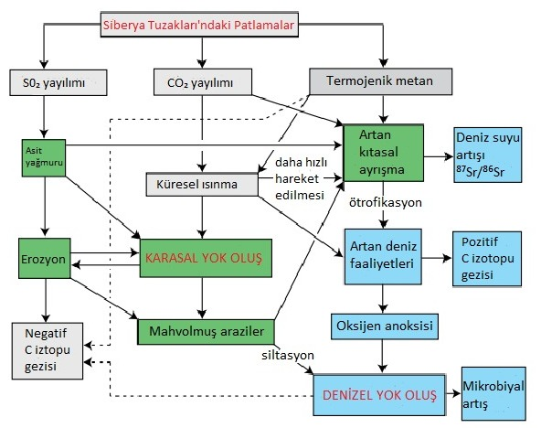 Sibirya Tuzakları’ndaki volkanik aktivitenin zincirleme sonuçlarının bir modeli (Micheal J. Benton, 23 Nisan 2018, Royal Society Publishing).