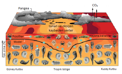 P-Tr kitlesel yok oluşuyla ilgili en güçlü hipotezlerden biri, Sibirya Tuzakların’daki (EN: Siberian Traps) volkanik aktivite kaynaklı CO2 yayılımıyla beraber sera gazlarının küresel ısınmayı tetiklemesi, bunun üzerine okyanuslardaki oksijenin ‘inin kaybolmasıdır (Justin L. Penn, Science, 7 Aralık 2018).