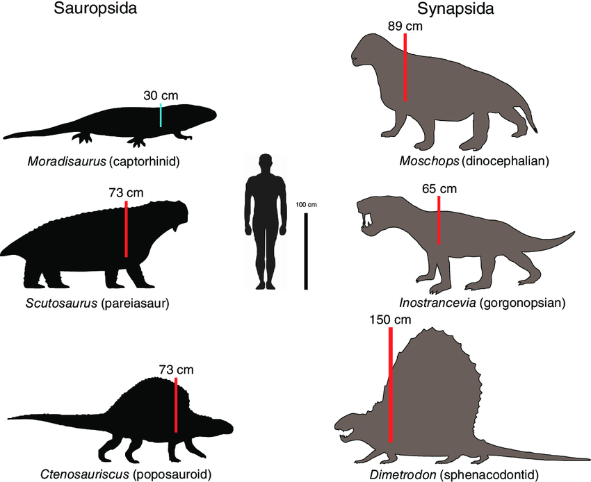 Permiyen ve Triyas sauropsitleri ve sinapsitlerinin bazı üyelerinin göreceli boyutlarının bir insanla karşılaştırılmış hali. Tahmini kalp konumundan vücudun tepesine kadar olan dikey mesafeler gösterilmiş.