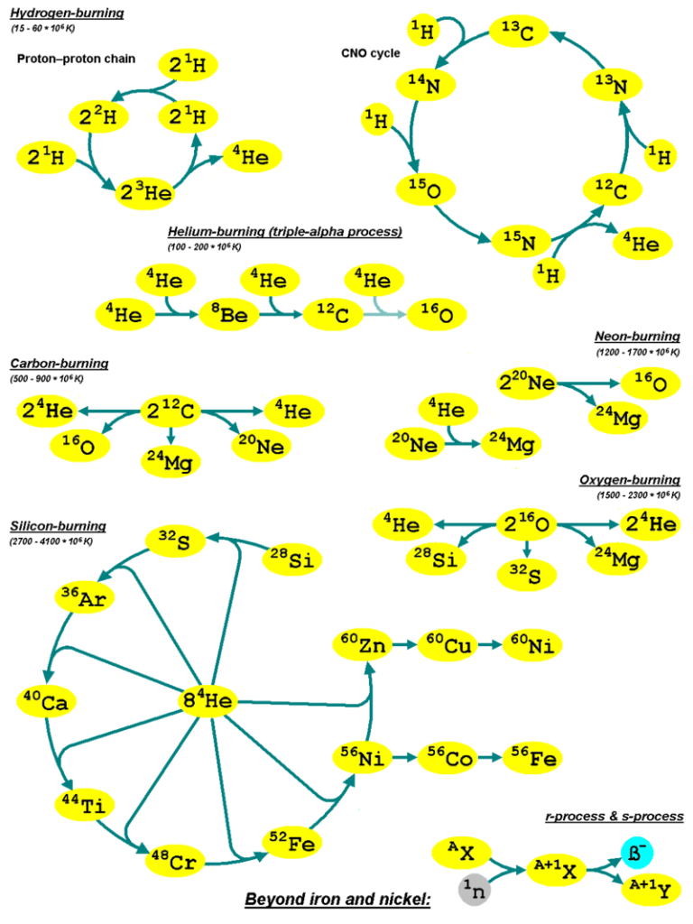 | Yakıt malzemesi | Oluşum | Sıcaklık (Milyon Kelvin) | Yoğunluk (kg/cm3) | Yanma süresi (Yılda τ kadar) |
